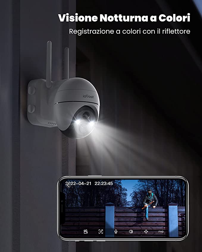 IeGeek 2K 360° PTZ - Telecamera Wi-Fi Esterno Senza Fili con Batteria, Videocamera Sorveglianza Wireless - Faretti con Pannello Solare,Visione Notturna a Colori,Sirena,Rilevazione PIR, IP65, 2 Vie Audio. Grazie alla rotazione orizzontale a 355° e alla rotazione verticale a 120° e 4X digital zoom, la telecamera Pan and Tilt wifi per esterni garantisce una ripresa panoramica di tutto ciò che ti circonda; e monitora ogni angolo della tua casa o del tuo negozio e nessun angolo morto di monitoraggio - Alimentazione a Pannello Solare & 100% - La telecamera wifi esterno senza fili con pannello solare e batterie ricaricabili da 15000 mAh aggiornate garantisce il controllo eterno. Non è necessario tirare cavi o praticare fori o preoccuparti di rimuoverla per caricarla - 2K QHD & Visione Notturna a Colori . La telecamera wifi esterno batteria è dotata di sensore di colore CMOS 1/3, che fornisce immagini e video cristallini indipendentemente dalle condizioni meteorologiche. 2+2 luci a infrarossi e bianche, che possono accendersi automaticamente quando rileva un movimento per registrare immagini e video, puoi anche accendere manualmente le luci quando necessario per spaventare gli intrusi o vedere più chiaramente - Sirena & Rilevamento del Movimento PIR Intelligente. La telecamera batteria rileva in modo intelligente il movimento delle persone in tempo reale; quando rileva le persone, sarai avvisato entro 1-3 secondi. Di notte, la telecamera emetterà automaticamente un allarme quando rileva un movimento, ma puoi anche attivarlo manualmente in qualsiasi momento per ricordare ai tuoi familiari da remoto la protezione - Connessione WiFi Stabile & IP65 Impermeabile: Le doppie antenne 4DBI conferiscono alla telecamera sorveglianza per una ricezione di rete più forte e più stabile rispetto ad altre telecamere. Il design impermeabile IP65 può impedire completamente l'ingresso di polvere e spruzzi d'acqua. Può funzionare in modo impeccabile, indipendentemente da forti piogge o esposizione al sole. La temperatura di funzionamento standard dovrebbe essere compresa tra -20 °C e 50 °C